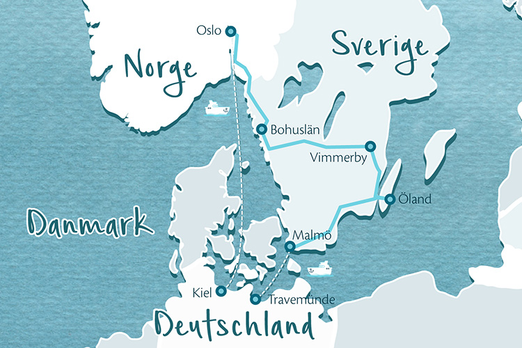 Dies ist der grobe Routenverlauf der Reise. Start in Kiel und Fährfahrt nach Oslo. Weiter geht es über Bohuslän und über Vimmerby nach Öland. Von Öland aus fahrt ihr nach Malmö uns setzt mit der Fähre nach Travemünde über, wo die Reise endet.